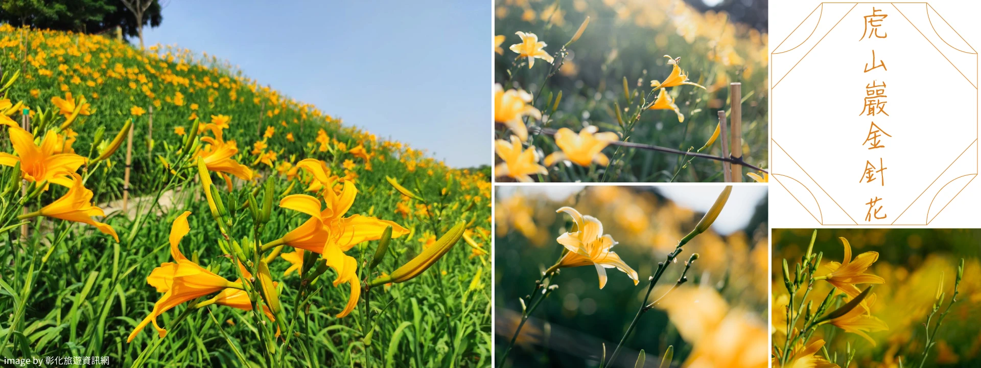 花壇虎山巖後方平緩山丘,近8萬多株金針花,從4月中旬陸續綻放,整片坡地染上了鮮黃色彩,在五月母親節,達到盛開的最高峰,滿山盡是黃金海,耀眼輝煌,形成一股賞花旋風,吸引絡繹不絕的人潮,行走在高低起伏的花徑中,享受被花海包圍,如置身一場無聲的盛宴,微風吹過,金色波浪在大地上起伏,讓人心醉。